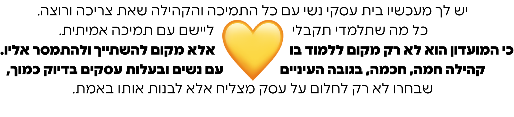 כאן יש לך קהילה מטורפת של נשות עסקים שתלווה ותרים אותך, כדי שלא תעברי את הדרך הזאת לבד.